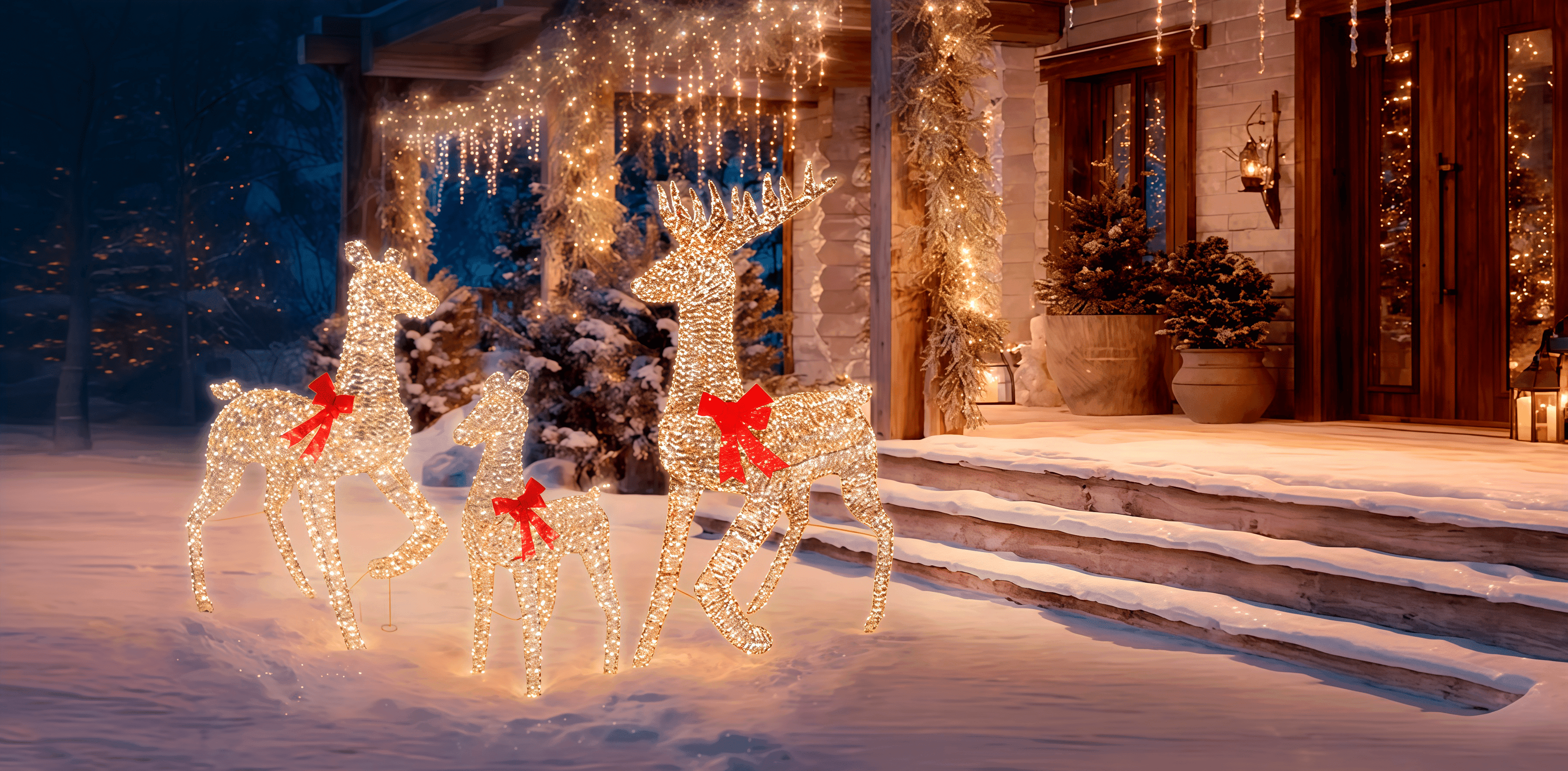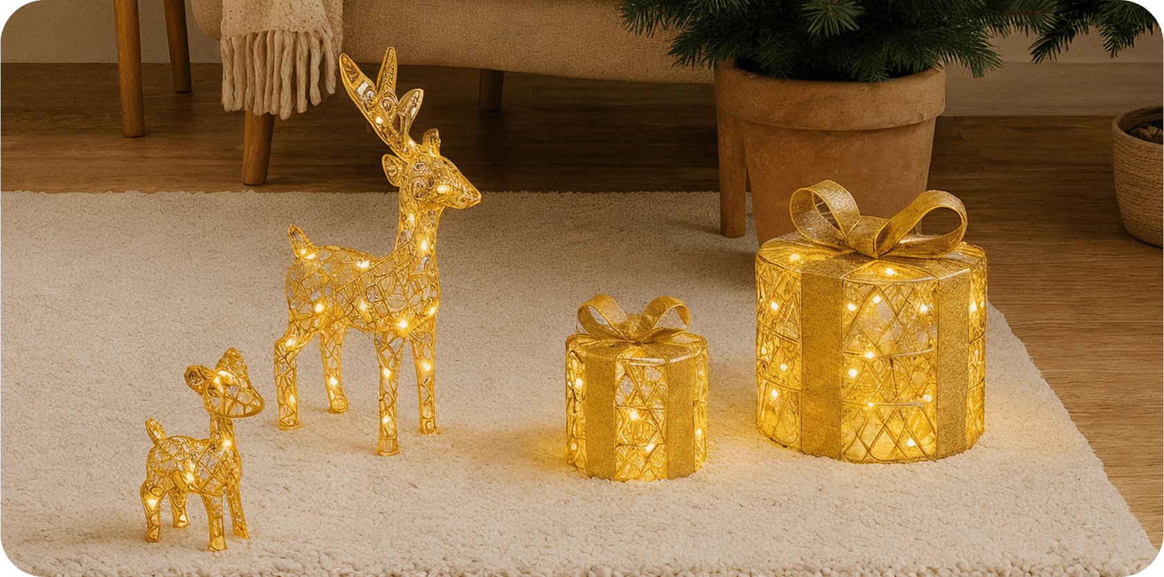 Это не просто украшения, а полноценные арт-объекты, которые придают вашему дому праздничное настроение, тепло и свет. Все фигуры работают от батареек, что позволяет расставлять световые акценты именно там, где хочется. Безопасный вариант для любых помещений.